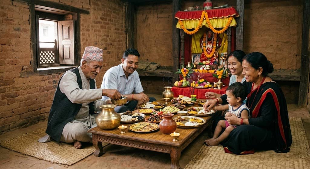 - कुल देवताको पूजा: यस दिन धेरैजसो नेवार परिवारहरूले आफ्ना ‘दिगु द्यः’ (कुल देवता) वा आगम देवताको विशेष पूजा अर्चना गर्छन्। परिवारको सुख, शान्ति र प्रगतिको लागि पितृ र देवताहरूको आशीर्वाद लिइन्छ।
