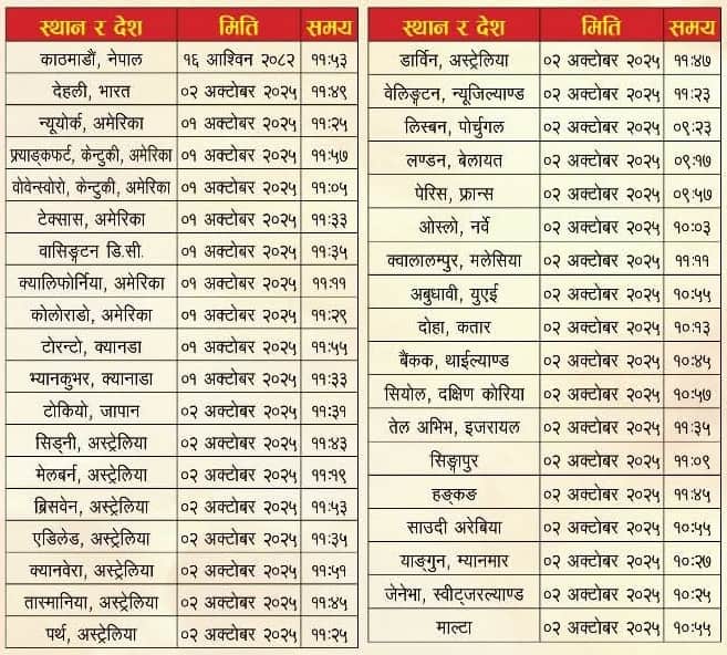 २०८२ दसैँ टीकाको साइत कुन देशमा कहिले ?